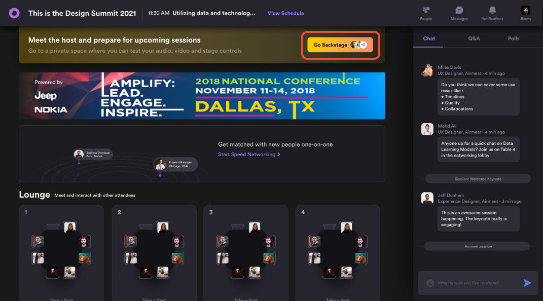 2. If you land in the social lounge, it means that the session is yet to start (paused or ended). Please make the most out of the social lounge during this time. The area allows you to interact with other participants of the event and hop between tables to meet new people and network.